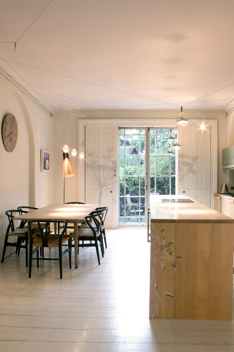Inspired as 'new' arts and crafts, a bespoke kitchen handmade in solid maple with hand carving and brass detailing, leading to a through living room with relaxed seating and bespoke alcove shelving with carved doors. French doors open on to the gardens, each one with a hand painted mural where the completed picture is revealed when the shutters are closed, of abstracted hellebores in the living room and fennel heads in the kitchen, also used to decorate the illuminated splash backs designed for the project. Lighting is suspended to avoid puncturing the original lathe and plaster ceilings. in the living room, a floor lamp crafted by Ango World is made up of hundreds of natural silk worm cocoons acts as a reading light over a vintage chesterfield daybed upholstered in Marimekko fabric.